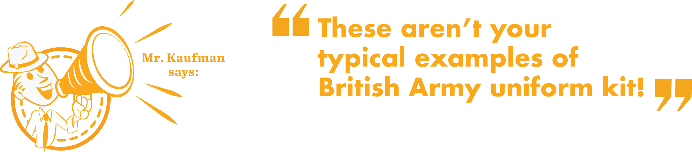 Other military surplus items have a fascinating story to tell from the very beginning. Mrs. Kaufman purchased just such an item decades ago from ‘across the pond’ in England. Even then she recognized just how special they were and set them aside as she would do with other unusual military surplus items. Today, many of these rarer surplus gems comprise the Kaufman Military Uniform Reference Collection, our own extensive collection of United States and foreign militaria.